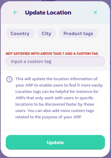 * Pilih negara dan kota di mana Anda beroperasi serta tag yang cocok dengan ARP Anda. Anda juga dapat menambahkan tag khusus jika Anda tidak dapat menemukan tag yang Anda sukai dari daftar tag produk. Anda hanya dapat menambahkan satu tag produk sekaligus, jadi pastikan Anda hanya memilih satu tag produk atau masukkan satu tag produk kustom.