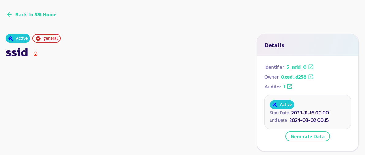 Klik tombol **Generate Data** dan isi dengan SSID yang sama persis yang Anda masukkan dalam langkah-langkah di atas, pastikan Anda juga mencentang Ya untuk bidang **Apakah Anda Auditor** dan kemudian validasi transaksi.