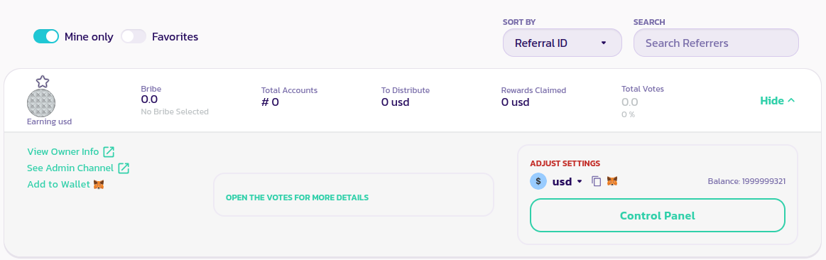 রেফারেল চুক্তিটি মিনটার থেকে একটি নির্দিষ্ট সংখ্যক সাপ্তাহিক নির্গমন পায়। রেফারেল চুক্তিতে পাঠানো মোট টোকেনের সংখ্যা নির্ভর করে রেফারেল চুক্তিতে সপ্তাহে কত ভোট হয়েছে তার উপর৷