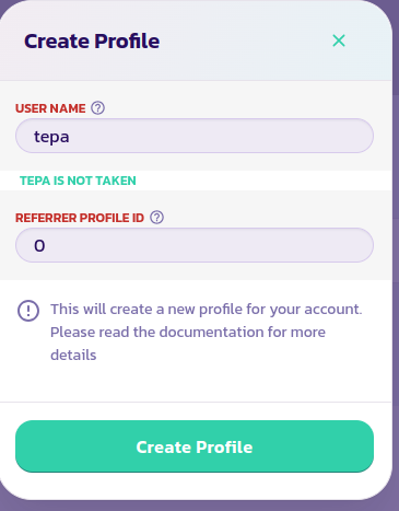 * Für diesen Schritt musst du ein Profil erstellen. Klicke auf die Profilerstellungsseite und dann auf den Button **Profil erstellen**. Fülle das Formular mit einem eindeutigen Benutzernamen und der Profil-ID des Benutzers aus, der dich auf die Plattform verwiesen hat (lass es einfach als 0 stehen, wenn dich niemand verwiesen hat). Validiere das Formular.