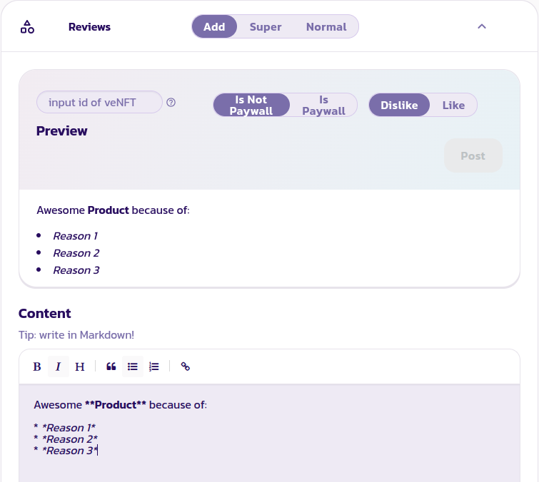 Superbewertungen unterscheiden sich von normalen Bewertungen darin, dass sie mit SuperLikes/SuperDislikes einhergehen (je nachdem, ob Ihnen das Produkt gefällt oder nicht). Sie können SuperLikes nicht spammen, da sie durch die Gesamtsumme der Mittel begrenzt sind, die Sie im Leviathan des Arbeitsbereichs gesperrt haben, zu dem Ihr Produkt gehört. Anders ausgedrückt, egal wie oft Sie ein Produkt mögen, die Gewichtung Ihres "Likes" wird durch das Geld begrenzt, das Sie unter dem Leviathan Ihres Produkt-Arbeitsbereichs gesperrt haben.
