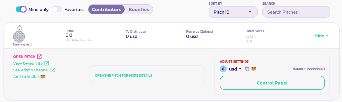 Der erste Schritt besteht darin, den Mitwirkenden auf der [Seite der Mitwirkenden](https://payswap.org/contributors) zu finden, sein Panel zu erweitern und auf die Schaltfläche **Pitch öffnen** zu klicken