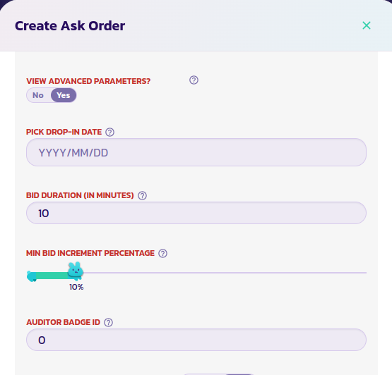 * Completa el formulario que aparece y establece el campo **View Advanced Parameters** (en la parte inferior del formulario) en **Yes** para revelar los campos que necesitarás configurar para tu subasta.