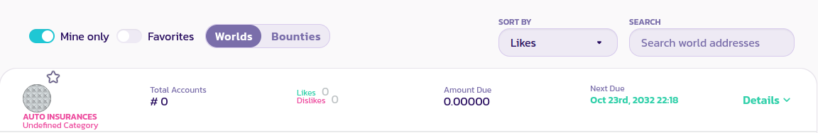* Marca el botón **Solo Míos** para mostrar solo tus contratos de mundo; esto debería ayudarte a encontrar el contrato de mundo que acabas de desplegar más rápido. Si no puedes encontrarlo, recarga la página e inténtalo nuevamente