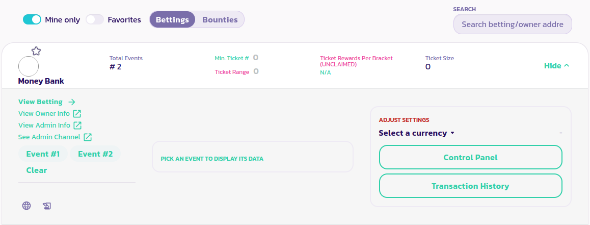 Vous devriez pouvoir voir votre contrat de paris en cliquant sur le bouton Uniquement les Miens qui ne listera que vos contrats de paris. Rechargez votre page si vous ne voyez pas votre contrat de paris