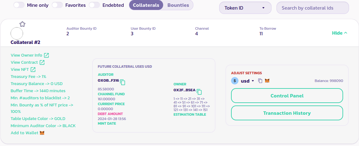 Lorsque vous récupérez votre collatéral de son NFT Bounty, assurez-vous de spécifier l'adresse du contrat de futur collatéral comme destinataire, sinon, vous ne pourrez pas récupérer le collatéral et il sera verrouillé pour toujours.