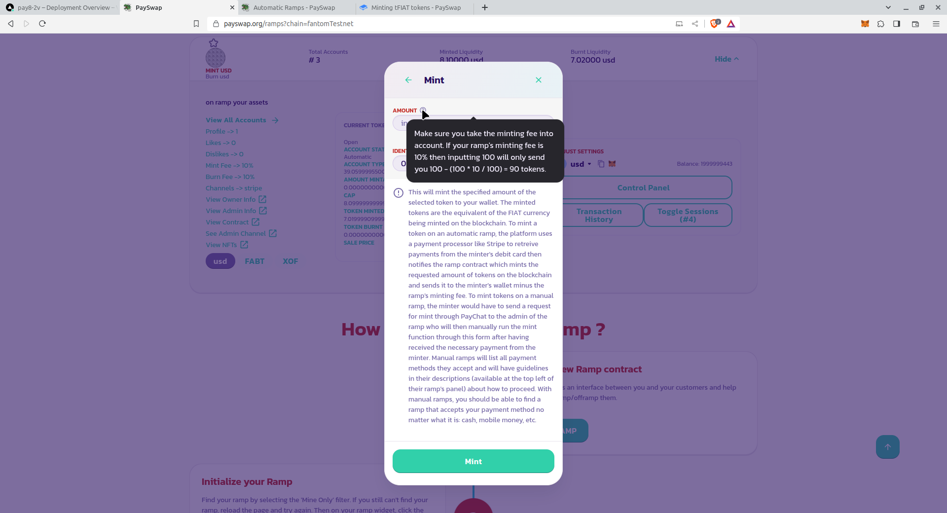 **CONFIRM MINT** 버튼을 클릭하고 거래를 유효하게 합니다. 방금 발행한 토큰의 양이 당신의 지갑으로 이체되고, dRamp의 발행 수수료 및 PaySwap의 발행 수수료가 제공된 것을 확인할 수 있습니다.