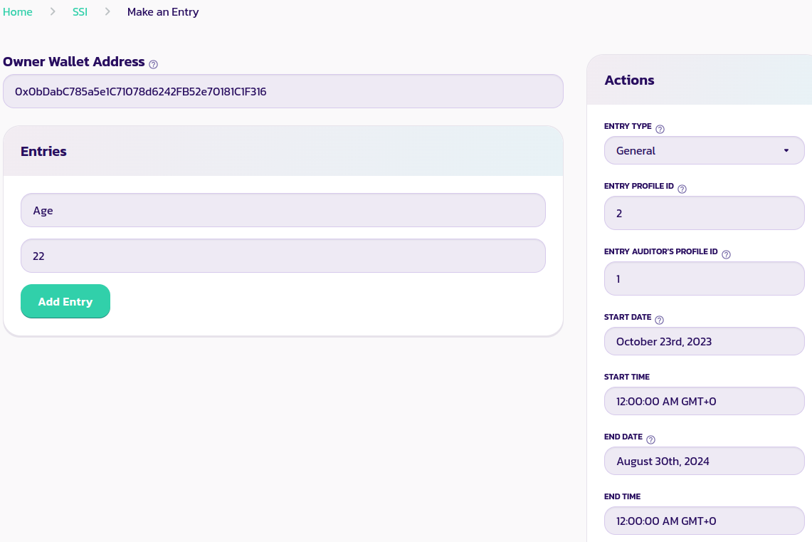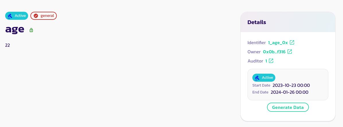 * 데이터 생성 페이지에서, 질문 필드에 나이 값을, 응답 필드에 사용자의 나이 값을 입력합니다. **Owner Wallet Address**를 사용자의 지갑 주소로 설정하고, 데이터 카테고리를 General로 선택하고, 사용자의 프로필 ID 뒤에 사용자와 당신의 ID, 오늘의 날짜 및 사용자의 국가 신분증 만료일을 입력합니다. 우리 경우에는 사용자의 출생일인 8