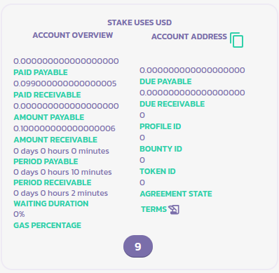 스테이크 9가 소유자가 만든 제품/서비스를 요청하는 것을 알 수 있습니다. 소유자는 라이드 요청에 0.1 달러 (**수령 가능 금액** - 매개변수 섹션 상단에 **스테이크가 USD를 사용함**을 읽을 수 있으므로 USD임을 알 수 있습니다)를 10분마다 지불할 것입니다 (**수령 가능 기간**). 사용자는 이미 스테이크에 0.099 달러를 예치했습니다 (**수령한 금액**).