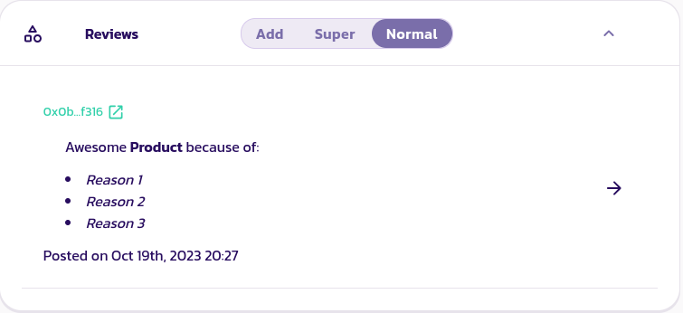 Qualquer pessoa que comprou um produto pode deixar uma avaliação super, mas para deixar uma avaliação super, você precisa ter um token do Leviathan do espaço de trabalho ao qual seu produto pertence. Isso torna as avaliações super muito mais confiáveis do que as avaliações normais, pois não podem ser spamadas.