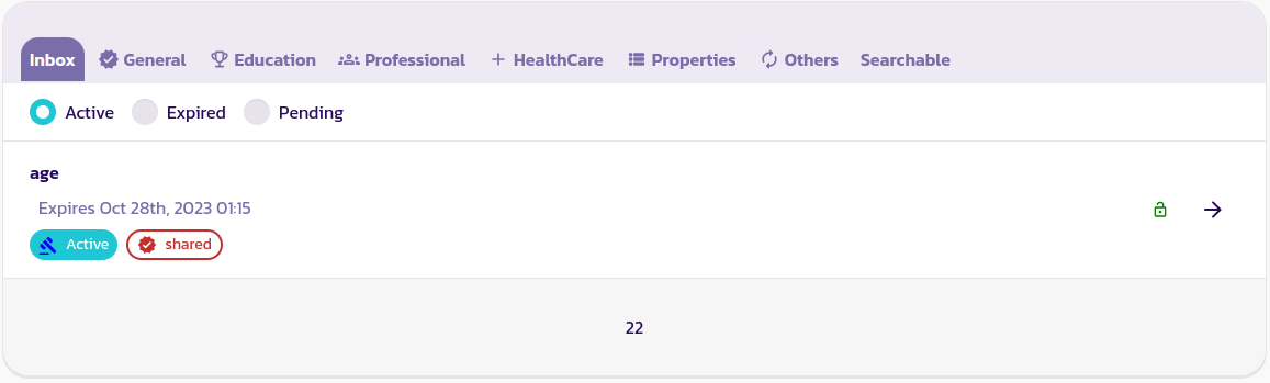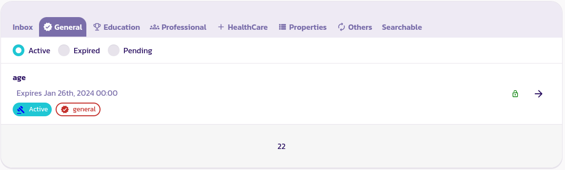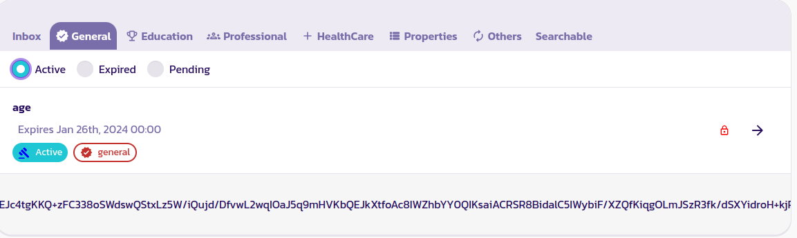 Uma vez que os dados tenham sido criados para você por um auditor confiável, eles se tornam disponíveis na página SSI na categoria que foi escolhida para eles. Você pode visualizar seus dados atualmente ativos, dados expirados ou dados pendentes (dados que se tornarão ativos no futuro).