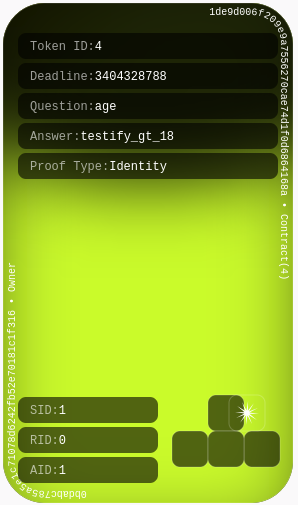 * Este token pode ser mostrado a seres humanos para comprovar a idade adulta e seu ID pode ser inserido ao chamar determinadas funções de contrato inteligente para comprovar a idade adulta para esses contratos.