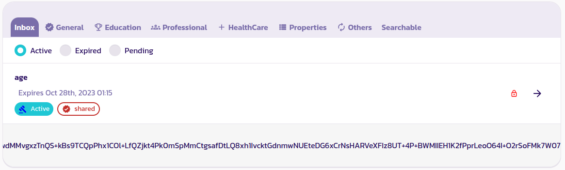 * Valide a operação e volte para a página inicial do SSI para visualizar seus dados compartilhados. Neste exemplo, compartilhamos o dado conosco mesmos, então ele estará disponível em nossa **Caixa de Entrada** porque se o tivéssemos compartilhado com outra pessoa, não estaria. Todos os dados compartilhados com você estão disponíveis em sua caixa de entrada junto com a data em que você não poderá mais visualizá-los (que em nossa imagem de exemplo é 28 de outubro de 2023 às 1:15 AM.