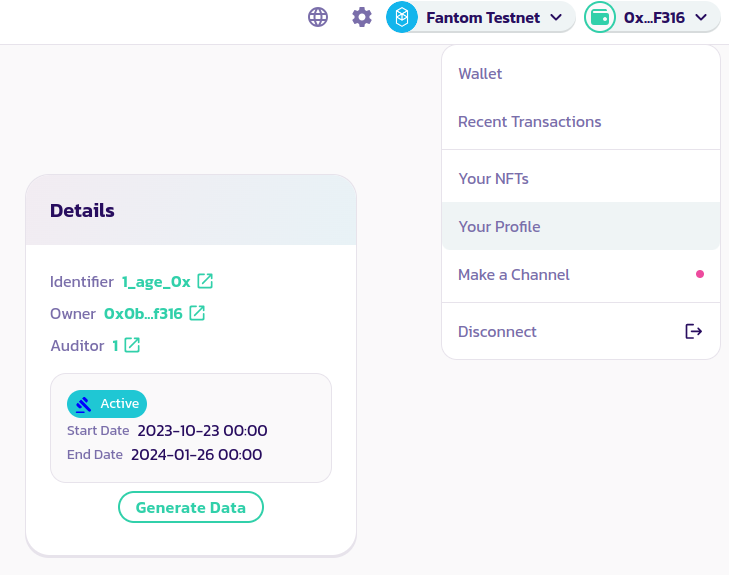 * O processo é semelhante ao dos tokens de identidade. Vá para a página do dado, descriptografe-o e clique no botão **Gerar Dados**
