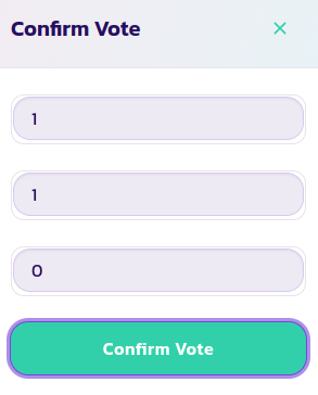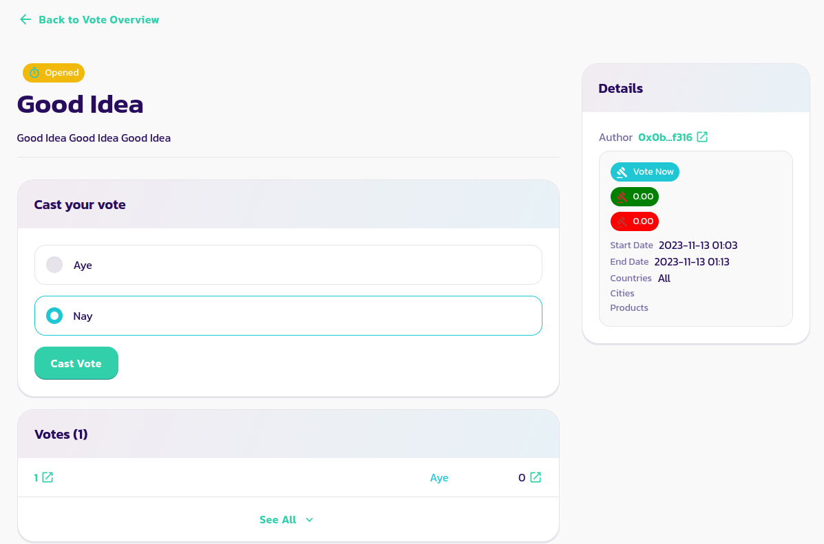 Click on the Cast Vote button, fill in the pop up form with your valuepool NFT's ID, you profile ID and your identity token ID (for which you should put in 0 unless your valuepool has a certain identity requirement for proposal voters)