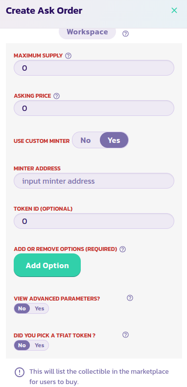 * Прочтите описание каждого параметра и укажите соответствующее значение. После валидации формы через несколько секунд вы должны увидеть свой NFT отображенным среди остальных ваших предыдущих NFT. Перезагрузите страницу, если ваш NFT не отображается. Установите параметр **Use Custom Minter** в Yes, как на изображении ниже, и введите адрес вашего контракта NFT в поле **Minter Address**. Подтвердите транзакцию.