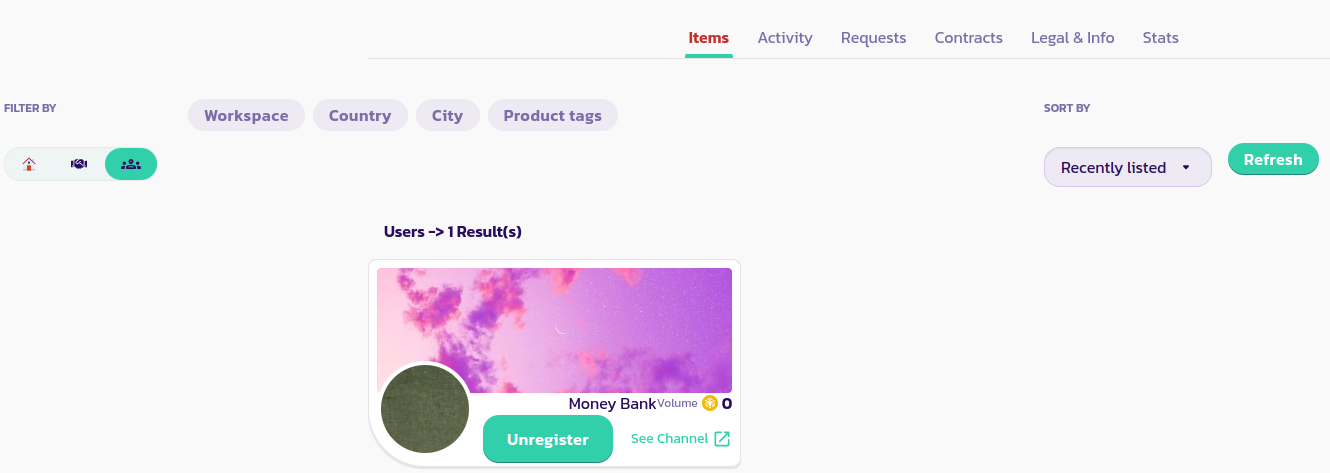 После регистрации пользователя в вашем канале профиль этого пользователя будет отображаться на вашем основном канале в разделе **Элементы > Пользователи**, как показано на изображении ниже: