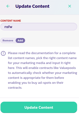 Sponsor sözleşmenizin içerik adlarını güncellemek için, kontrol panelinizin menüsüne gidin ve **İçeriği Güncelle** düğmesine tıklayın. Aşağıdaki resimdeki gibi reklam materyalinizi karakterize eden tüm içerik adlarını girin. İşlemi onaylamadan önce, **Ekle** seçeneğini işaretlediğinizden emin olun.