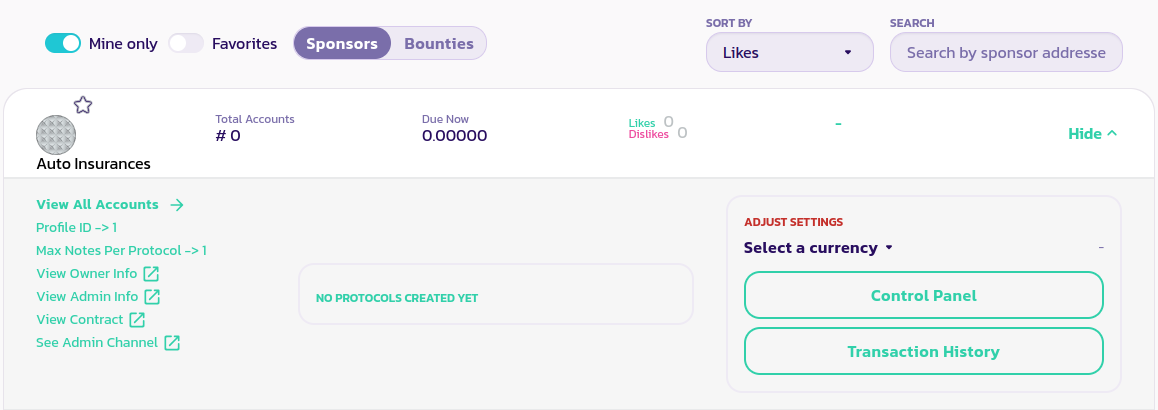 * Yalnızca kendi sponsorluk sözleşmelerinizi listelemek için **Yalnızca Kendim** seçeneğini işaretleyin. Bu, hızlı bir şekilde dağıttığınız sözleşmeyi bulmanızı sağlar. Bulamazsanız, sayfayı yeniden yükleyip yeniden deneyin. Bulduğunuzda, panelini genişletmek için üzerine tıklayın.
