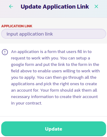 * Şimdi sözleşmenize bir başvuru bağlantısı eklemeniz gerekiyor, böylece iş yapmak isteyen kullanıcılar/şirketler başvurabilir. Google formuna, bir e-postaya veya sohbete bir bağlantı olabilir. Bunun için **Kontrol Paneli** düğmesine tıklayın ve açılan menüde **Başvuruyu Güncelle** düğmesine tıklayın. Bağlantınızı girin ve işlemi onaylayın.