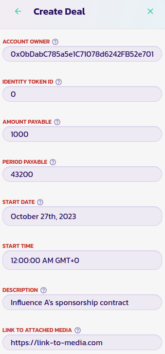 Yukarıdaki formda, her ay 1000 USD'lik bir ödeme planlıyoruz (bir ayda dakika sayısı). Etkileyicinin cüzdan adresini **Hesap Sahibi** alanına girdik. 2023 yılının 27 Ekim'inde gece yarısından itibaren saymaya başlıyoruz, bu da ilk ayın bundan sonra 43200 dakika olacağı anlamına gelir. Ayrıca, hesabın bir açıklamasını ve işletmemizi pazarlamak için etkileyiciye materyaller sağlamak için reklam içeriğimizin bir bağlantısını bırakıyoruz.