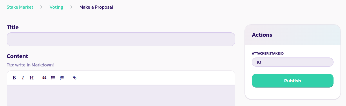 Bu, durumu güncelleme sayfasını açacak, burada bir başlık veya bir gövde girmenize gerek yoktur, sadece kazandığınız hukuki işleme saldırgan stakenin ID'sini girmeniz ve işlemi doğrulamanız gerekmektedir.