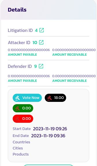 Ancak, bir stakemarket hukuki işleminin detay sayfası, bir trustBounty'nin detay sayfasından farklıdır. Bir stakemarket hukuki işlemde, hukuki işlemde yer alan her iki tarafın da önerilen koşullarını **Detaylar** bölümünde görebilirsiniz. Aşağıdaki resimde gördüğümüz gibi, her iki taraf da çatışan koşullar önermektedir, topluluğun oyunu kazanan tarafın koşulları, stakelerinin ortak anlaşmasının yeni koşulları olarak kabul edilecektir.