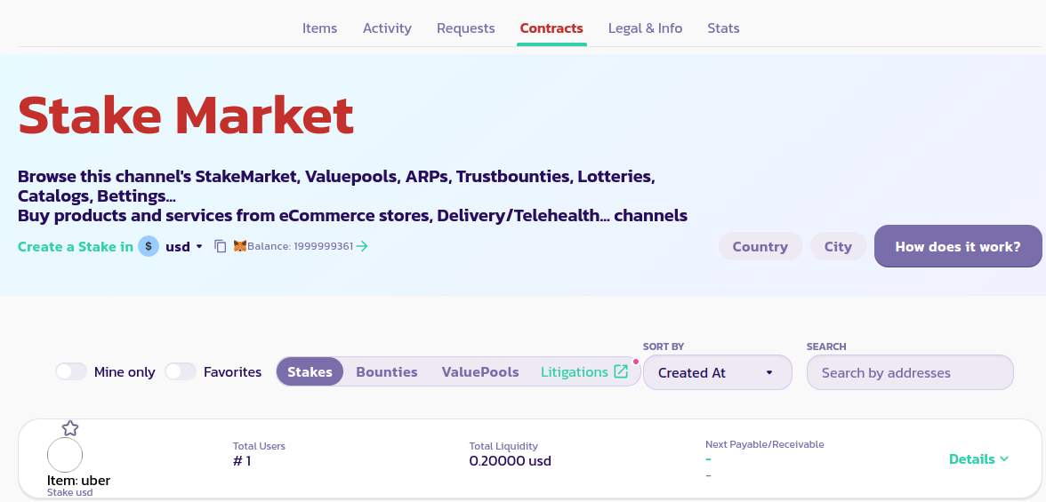 The request will be created as a stake and listed under the Contracts > Stakes tab like in the image above. This way potential delivery agents can browse the latest requests in their areas and apply to the ones that are the best fit for them.