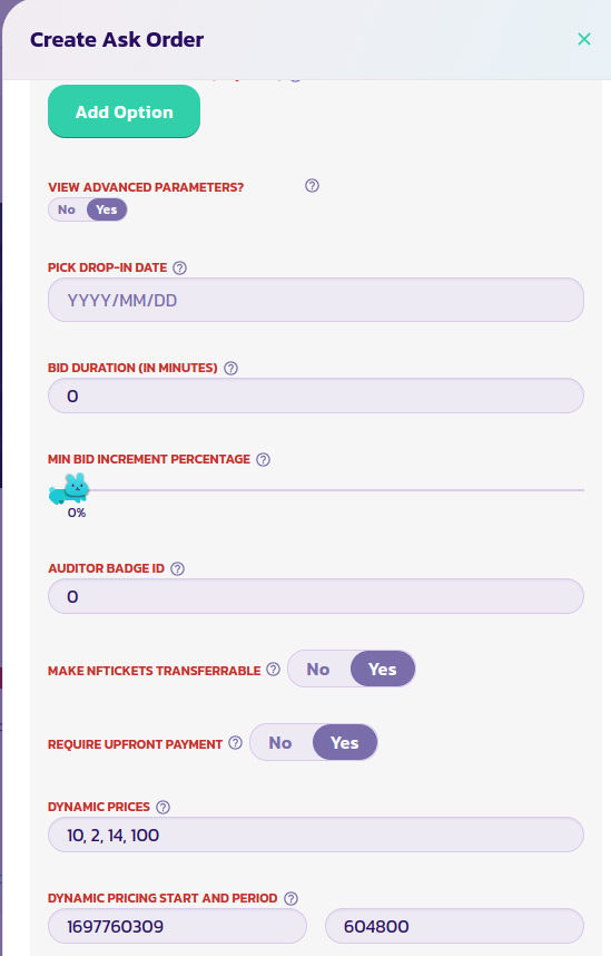 您可以在列出产品时设置动态定价的参数。在列表形式的末尾，将**查看高级参数**参数设置为**是**以查看高级参数。找到**动态价格**字段，并输入适合您的价格数组、起始时间和周期的相应值。显然，这是在填写关于您要列出的产品的所有先前值之后。